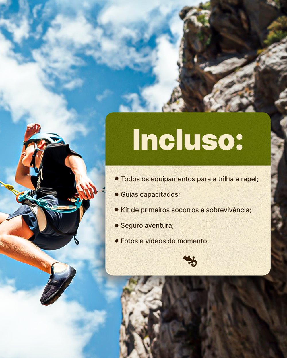 ☀️ E tem mais: após o rapel, ainda dá tempo de relaxar e nadar nas águas cristalinas das cachoeiras da serra — um refresco perfeito para encerrar a aventura com chave de ouro.